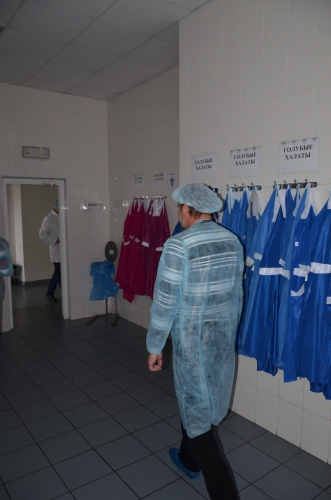 Переступаем порог завода и попадаем в помещение где работники, при необходимости принимают душ, облачаются в рабочую одежду. На стенах висят халаты разного цвета, один цвет — одно рабочее помещение (или процесс), поскольку считается нежелательным пересечение работников из зон с разным уровнем риска.