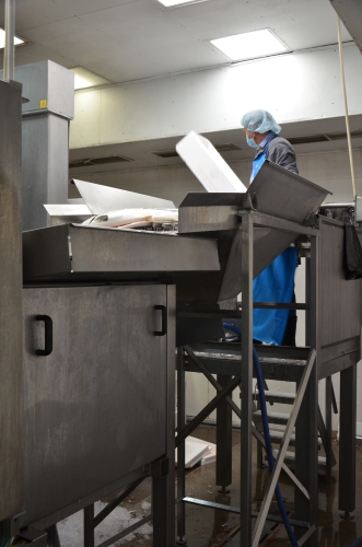 Процесс обработки продолжается... Забавный момент — кто-то из гостей увидел в цеху инъектор, и сразу осведомился у Олега Чубукова, как мол так, тоже выходит «химичите»? Утяжеляете продукт влагоудержвающими компонентами?! На что нам была прочитана маленькая лекция по техпроцессу, смысл простой — филе рыбы имеет разные размеры, брюшная часть небольшая, а спинка намного больше, и чтобы обеспечить равномерность засолки необходимо получить доступ в глубину тушки.