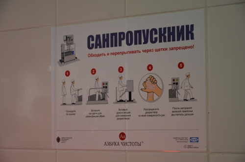 Наш следующий шаг — санпропускник, сооружение через которое можно пройти только совершив ряд процедур: моем руки, сушим их, наступаем обувью в спецраствор и нам загорается зеленый свет, вперед.